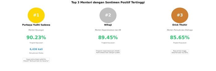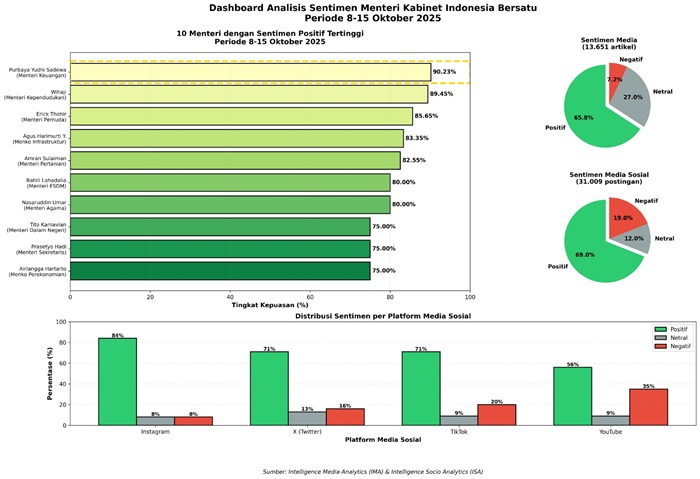 Berdasarkan hasil penelitian dari Intelligence Media Analytics (IMA) dan Intelligence Socio Analytics (ISA) periode 8-15 Oktober 2025, serta survei nasional Index Politica, berikut adalah 10 menteri yang mendapat sentimen positif tertinggi: