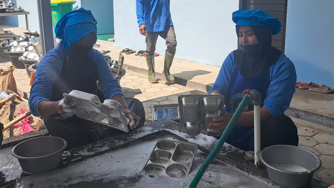 Dua di antaranya adalah Misiati (50) dan Dwi Sugiarti (31) — ibu rumah tangga yang kini punya kesibukan baru sebagai pencuci piring relawan MBG.