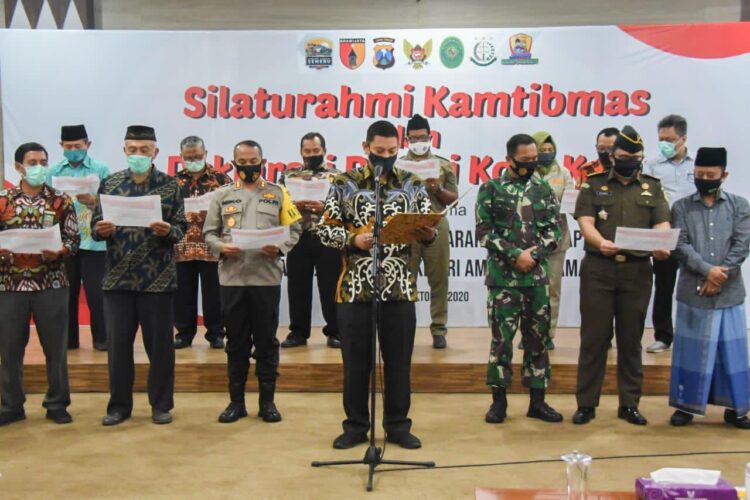 KEDIRI – Buntut adanya aksi demo ricuh di beberapa daerah tak terkecuali Kota Kediri, Forum Komunikasi Pimpinan Daerah (Forkopimda) Kota Kediri mengadakan deklarasi damai untuk menolak tindakan anarkisme saat aksi unjuk rasa.