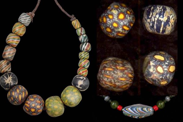 • Tipe I: Mosaic Eye Beads – Irisan cane mosaik rumit ditempel pada inti kaca limbah. Pola mata (eye motifs) dibuat dengan lapisan berwarna yang saling tumpuk, menciptakan efek 3D.