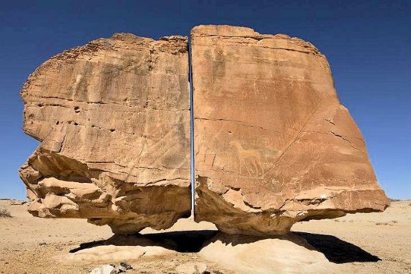 Setinggi 6 meter dengan lebar 9 meter, batu Al Naslaa terbelah sempurna menjadi dua bagian, seolah dipotong oleh pisau laser modern.