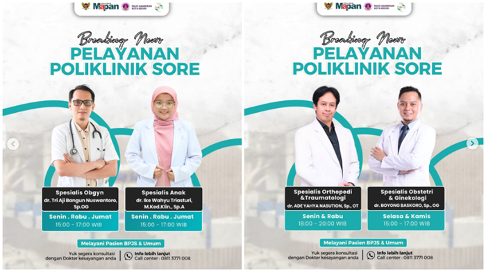 Dengan penambahan ini, masyarakat bisa menikmati layanan pemeriksaan kandungan oleh dr. Boyong Baskoro, Sp.,OG., maupun pemeriksaan tulang oleh dokter ahli bedah ortopedi dan ahli tulang, dr. Ade Yahya Nasution, Sp.OT.