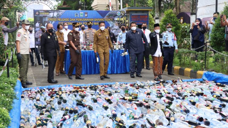 Polres Malang memusnahkan sebanyak 1.757 botol miras dari berbagai merek, 54.226 butir pil dobel L, 4.464,86 gram sabu dan 1.191,86 gram ganja. Ribuan barang bukti ini didapat dari 248 kasus dengan 270 tersangka.