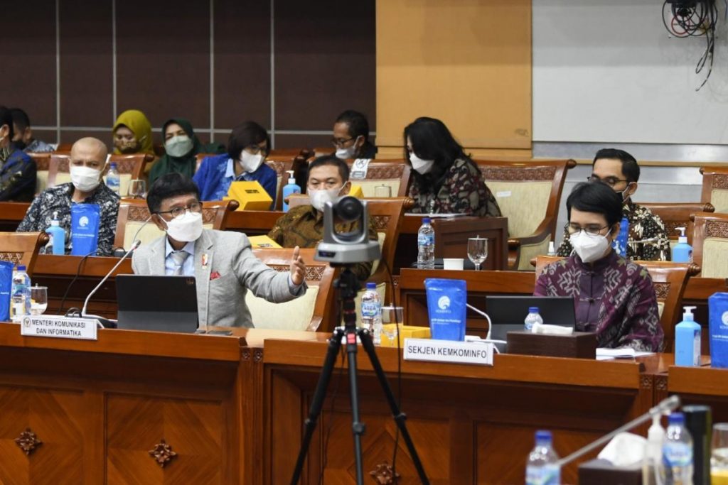 Dalam Raker bersama Komisi I, Menkominfo Johnny G. Plate didampingi Sekretaris Jenderal, Mira Tayyiba; Direktur Jenderal Sumber Daya Perangkat Pos dan Informatika, Ismail; Juru Bicara Dedy Permadi, serta Staf Khusus Philip Gobang dan Rosarita Niken Widiastuti.(ADV)