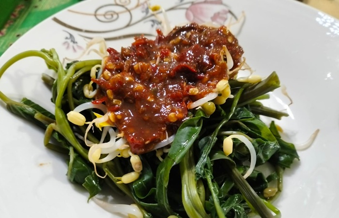 Sayur dan kecambah itu direbus setengah matang, sehingga masih menyisakan teksturnya yang agak keras dan kenyal. Sementara di sampingnya tampak satu mangkuk sambal cabe berwarna merah. “Ini sambal terasi ya,” tanyaku.