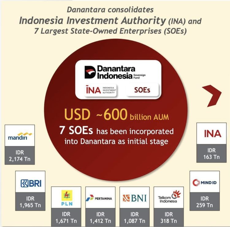 Perusahaan BUMN yang akan dikelola dan diambil alih oleh Dantara Indonesia ini diantaranya Bank Mandiri, Bank BRI, PLN, Pertamina, BNI, Telkom Indonesia, MIND.ID dan INA (Indonesia Investment Authority).