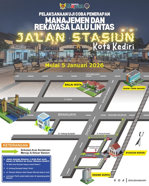 Penerapan manajemen dan rekayasa lalu lintas ini sedianya dilakukan Dinas Perhubungan Kota Kediri mulai hari ini, Senin, 5 Januari 2026. Peraturan itu meliputi: