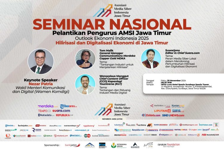 “Nezar Patria Wamen Komdigi telah menyatakan siap akan mengisi Seminal Hilirasiasi dan Digitalisasi di Jawa Timur, demikian juga narasumber lain juga telah menyatakan hadir,” kata Yatimul Ainun Ketua AMSI Jawa Timur, Senin (18/11/2024).